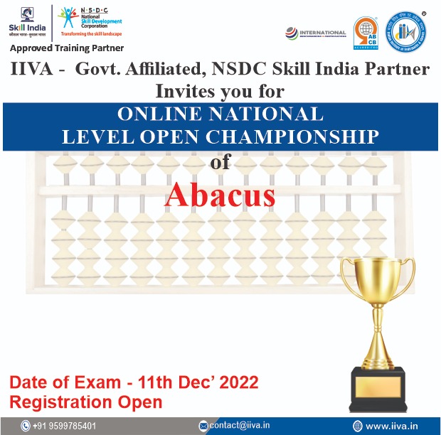 SPECIAL NOTE:- Finally We are approaching towards National Maths Day 2022.. Before The Celabration IIVA is conducting Online National level championship Of ABACUS & VEDIC MATHS Open for all.. You might have learned form anywhere You might be in any part but You can appear for :-